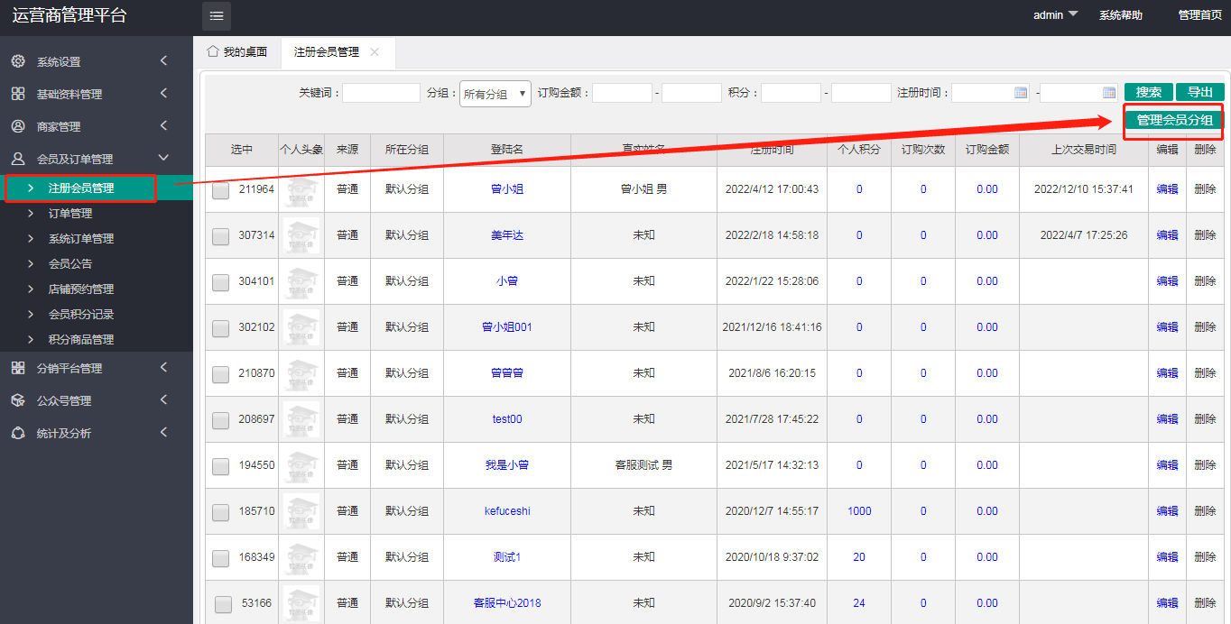 注冊會員管理是記錄前臺注冊或者是用微信授權(quán)登錄的賬號,并可對會員進行分組管理,編輯會員資料、修改密碼、郵箱、刪除會員等操作。如下圖所示: