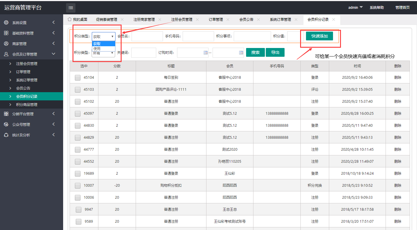 會員積分記錄各個會員積分的獲取及使用的情況,每一分的記錄均可查!同時可在最上方給某一個會員快速充值或消耗積分,此方法可考慮用于充值送積分活動,充值100元贈送120積分,120積分當(dāng)120元花。如下圖所示:
