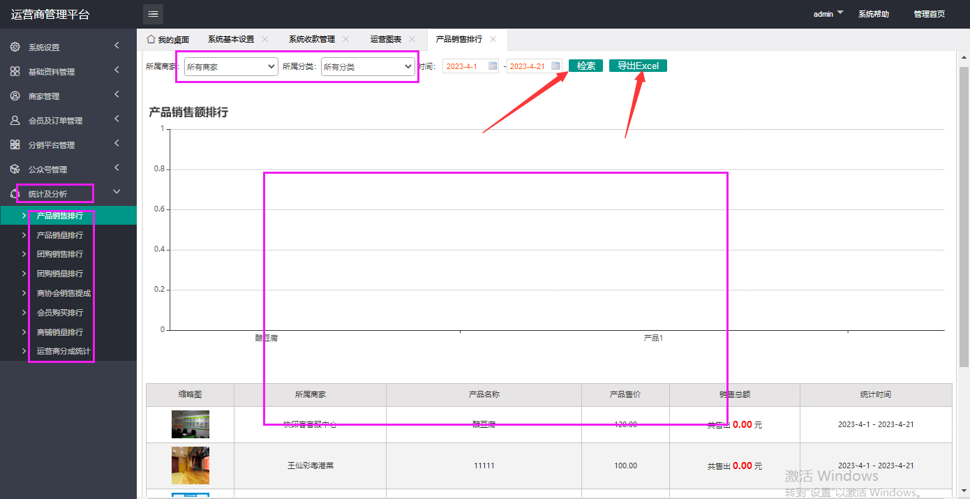 8、關(guān)于統(tǒng)計及分析,點擊該板塊后可看到整個平臺相關(guān)產(chǎn)品、商鋪、團購銷量等各類排行數(shù)據(jù)信息,亦可根據(jù)所屬商家/分類等進行快速檢索以及對應(yīng)導(dǎo)出表格文件,如下圖所示: