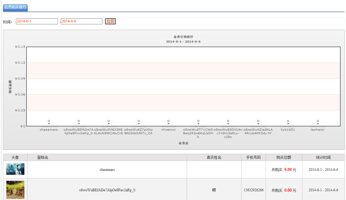 平臺運營商可在此查看所有會員的購買排行;并可根據(jù)時間檢索數(shù)據(jù)。下圖為細(xì)節(jié)說明: