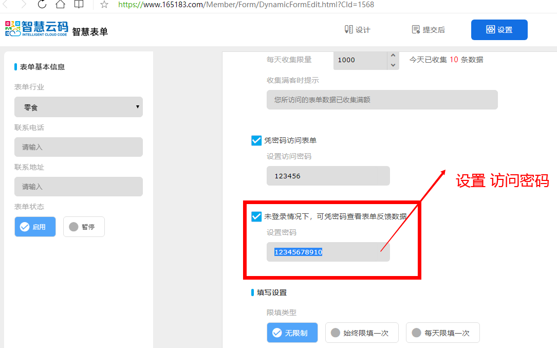 1、在表單設置中,設置訪問密碼